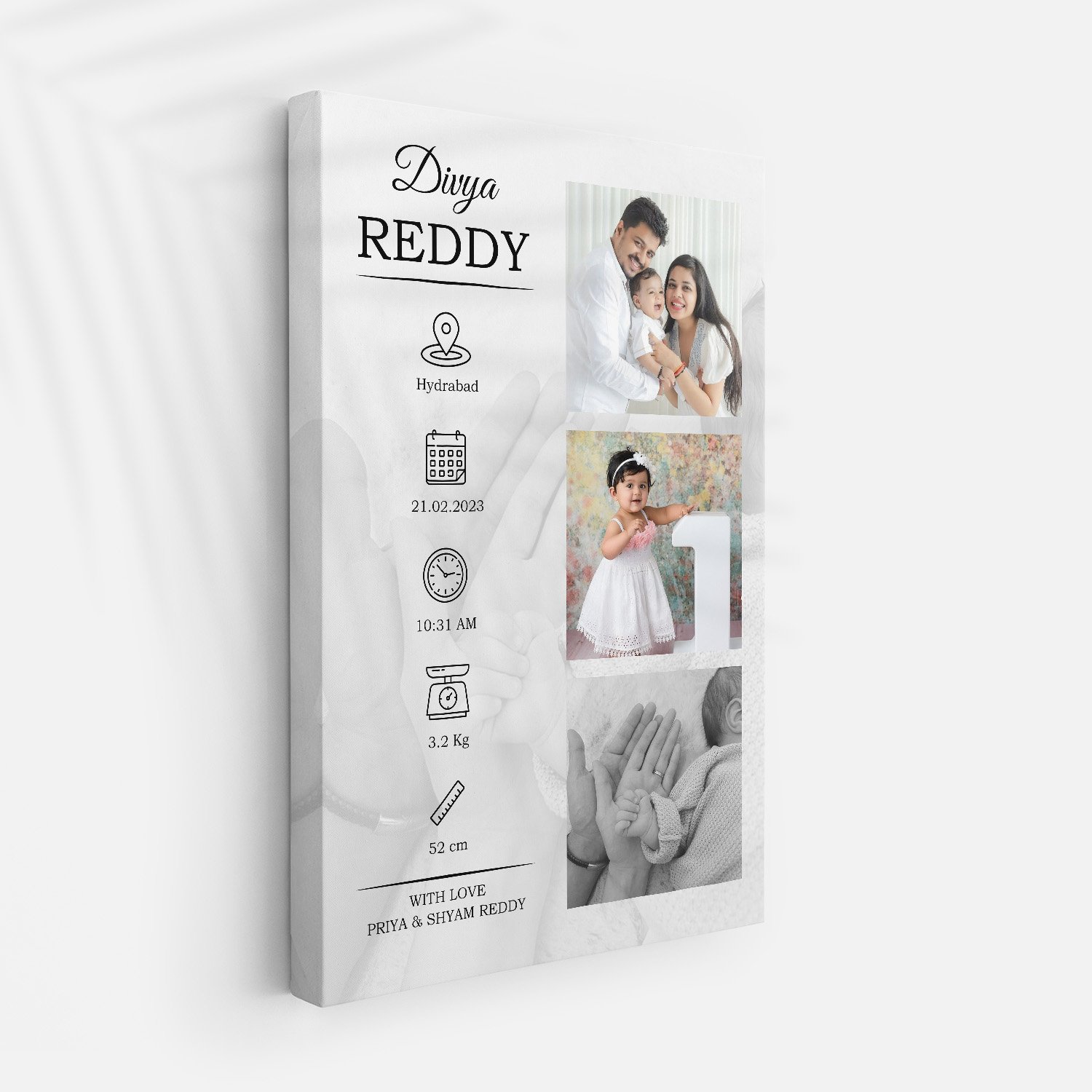 A baby’s first photo combined with their birth details creates a heartfelt storytelling moment.