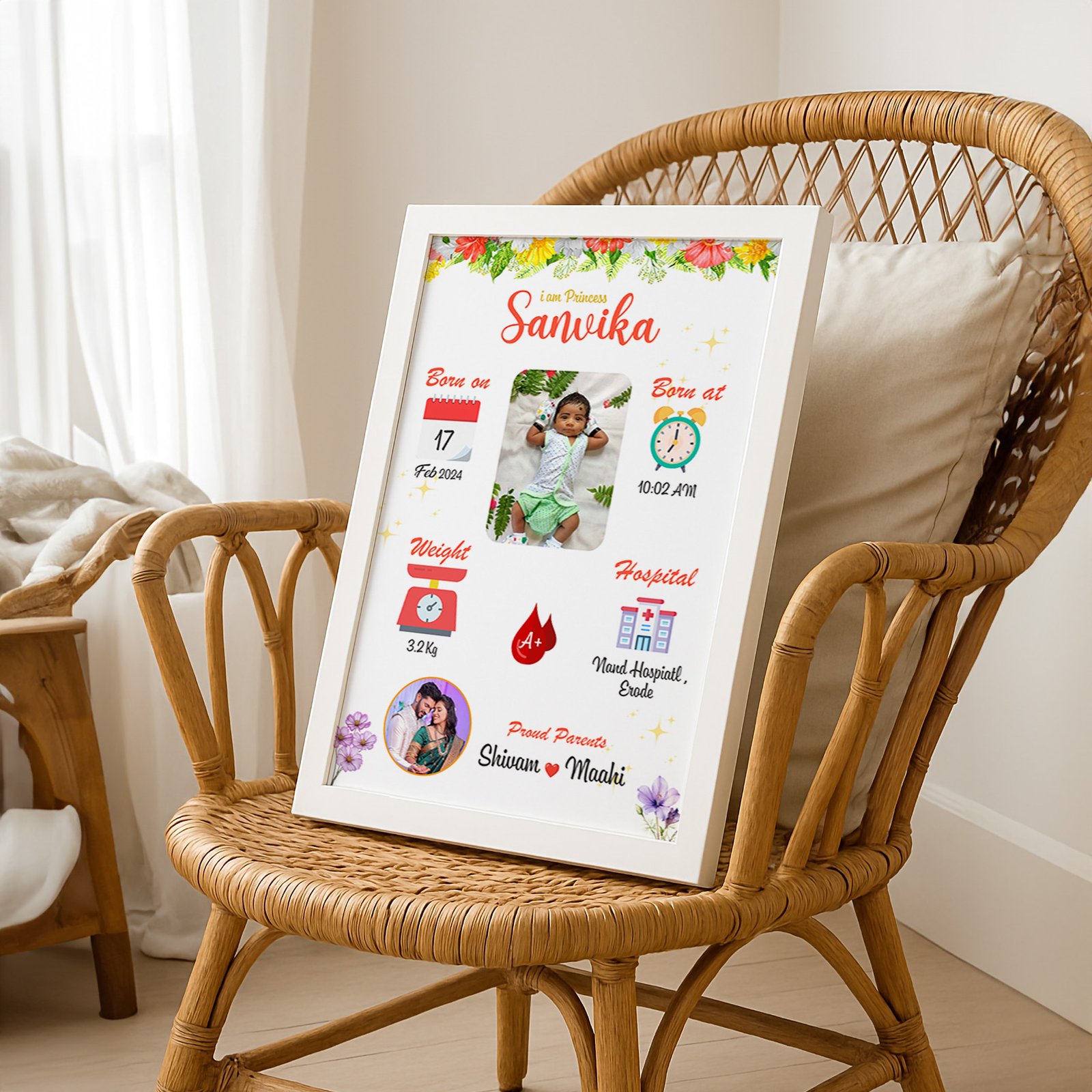 Personalized Baby Birth Details Photo Frame – Custom Newborn Name, Date, Time & Weight Wall Art